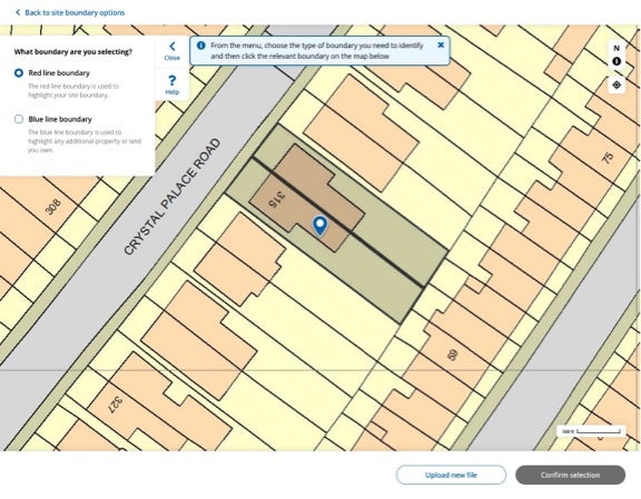 If there are any additional related properties to be included, you can select the ‘Blue line boundary’ tool and continue to mark in the same way. Complete this by clicking ‘Confirm selection’ to continue with your application.